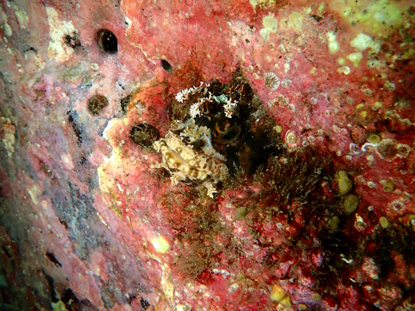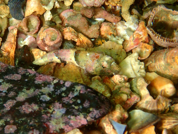 マダコは何ヵ所か抱卵継続中、婚姻色のクジメ、大きなアイナメやクロソイ、砂礫に隠れるセトカジカなども観察しました。