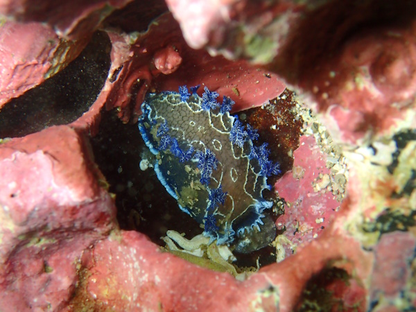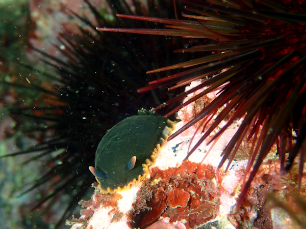 ウニの合間を縫ってクロシタナシウミウシが散歩中でした。