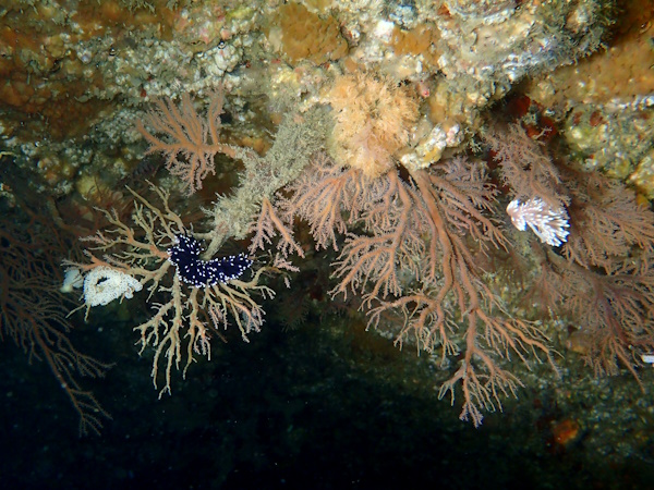 ホヤの1種の表面にはコトヒメ、岩肌に集まるシロイバラ。