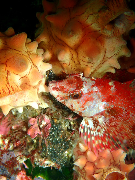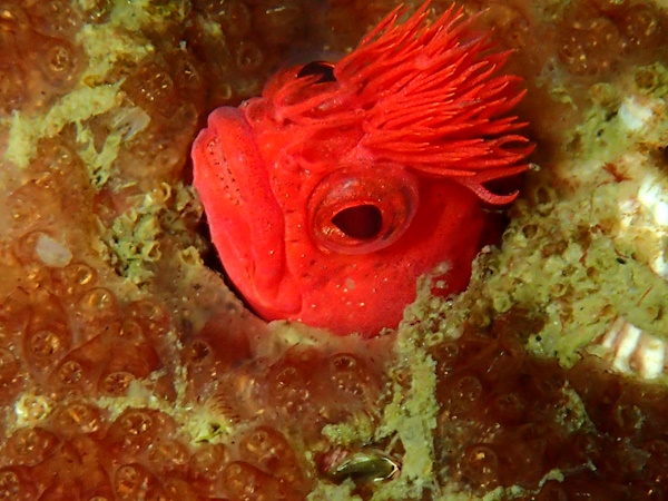 赤い婚姻色が鮮やかなオスは、ホヤの根元に産み付けられた卵塊を守っています。