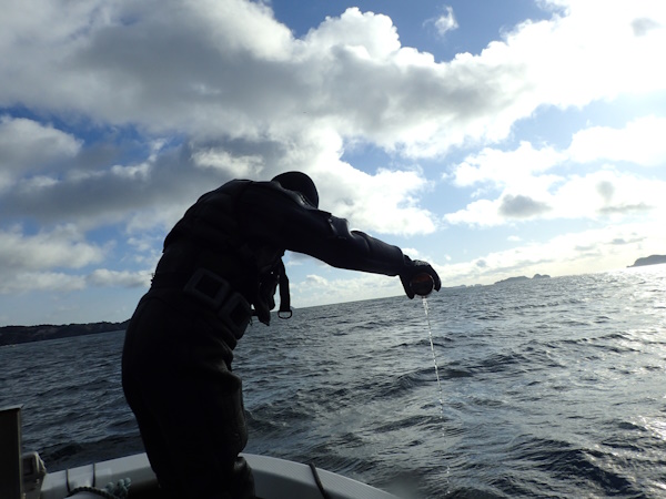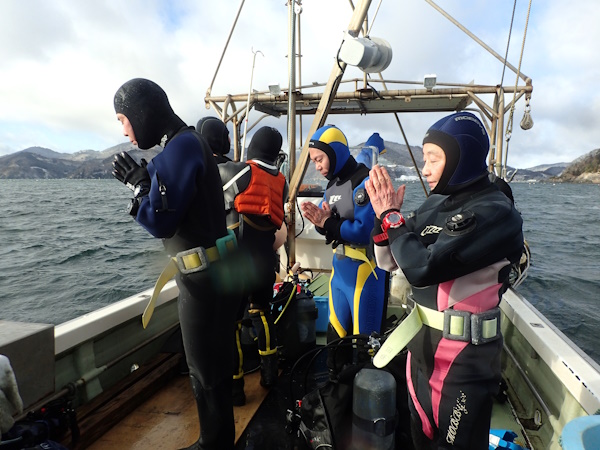 女川の海に御神酒を注ぎ、2026年の海上安全・海中安全を祈ります。