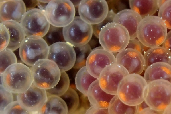 卵の中の仔魚がバッチリ見えますが、ハッチアウト開始はまだでした。