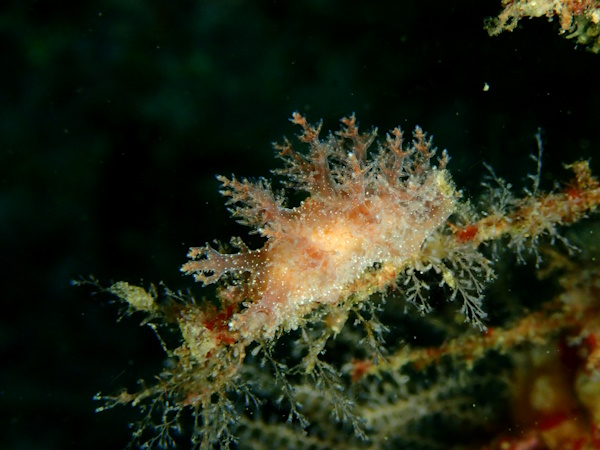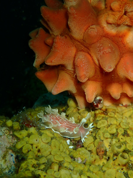 黄色いミノウミウシが「何ウミウシかな~?」と首を傾げながら観察しつつ、目線をちょっと横に逸らしたら…!おおぉぉぉ!!